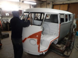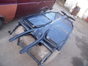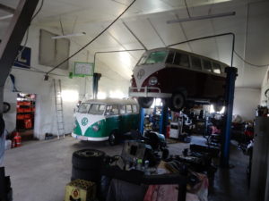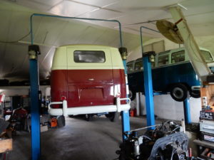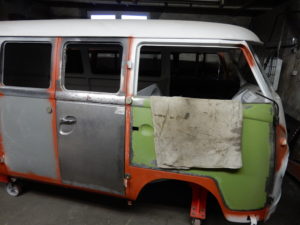 Seit 20 Jahren war der Surfbus eines bekannten Dresdner Clubbesitzers in unserer Werkstatt regelmässig zur Wartung. Leider verweigerte der TÜV 2016 seinen begehrten Segen wegen diverser Durchrostungen , vor allem im Schwellerbereich und am Vorderachskörper. Und so kam es wie es kommen musste-der Wagen wurde teilzerlegt , um die Reparatur zu beurteilen und zu planen: